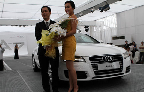 sang khi trở thành khách hàng đầu tiên mua xe Audi A7 Sportback mới, màu trắng