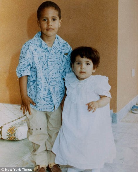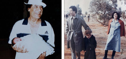 Gaddafi mặc áo khoác hiệu Adidas khi bế con. Bức ảnh bên phải chụp cảnh Gaddafi cùng vợ Safia và một đứa trẻ chưa xác định được danh tính tại một tỉnh gần Tripoli.