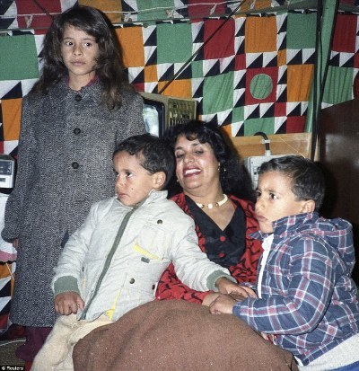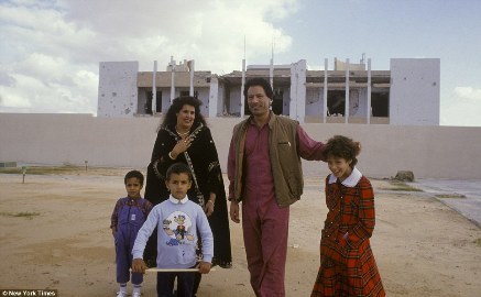 Cả nhà Gaddafi đứng chụp ảnh bên ngoài dinh thự Bab al-Aziziyah từng bị Mỹ đánh bom năm 1986.