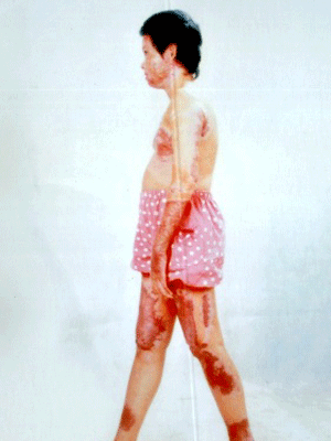Với bề ngoài khủng khiếp hiện nay, bé Hiệp luôn hoảng sợ mỗi khi có người lạ vào nhà.