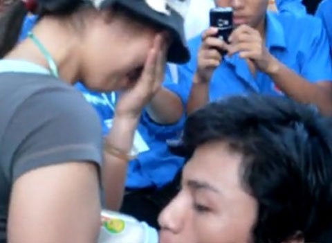 hai sinh viên nữ trong tiếng cổ vũ của đám đông, vừa được tung lên mạng