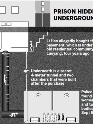 Li Hao đã thú nhận mua lại tầng hầm này bốn năm trước và đào một nhà tù sâu 4m dưới tầng hầm vào các buổi đêm. Hắn sống hai tuần trong một tháng với những phụ nữ bị bắt giữ. Li nói với vợ hắn phải đi làm ca đêm.