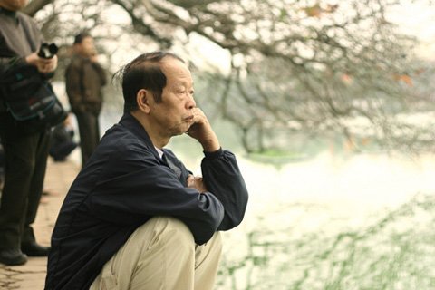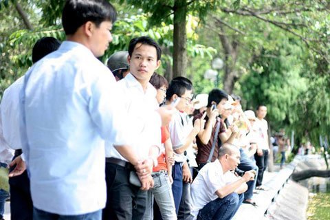 Khách nước ngoài dùng ốm nhòm để xem cụ rùa nổi