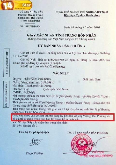Cư dân mạng còn kiếm ra một tờ giấy "xác nhận tình trạng hôn nhân" đóng dấu đỏ, đề ngày 18/11/2010, trong đó có viết: "Giấy này được cấp để làm thủ tục đăng ký kết hôn với chị Vương Thu Phương và có giá trị sử dụng trong thời hạn 6 tháng kể từ ngày cấp".