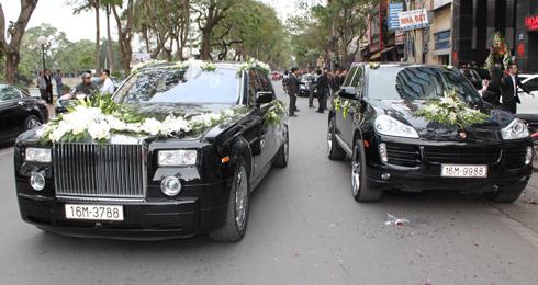 Sử dụng xe siêu sang cho ngày cưới đang trở thành trào lưu của các đại thiếu gia. Hải Phòng là nơi mới nhất trình diễn bộ sưu tập xe sang gồm Rolls-Royce Phantom, Mercedes CLS, Porsche Cayenne, Porsche Panamera trong đám cưới của chú rể tên H. (sinh năm 1984). Anh hiện đang kinh doanh bất động sản của tập đoàn tài chính Hoàng Huy tại Hà Nội.