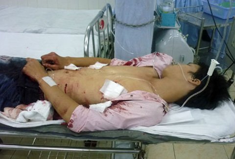 | Đối tượng Ngô Hùng Quân đang được cấp cứu tại bệnh viện vết nhiều vết đâm khắp người (Ảnh: Báo Đồng Nai) |