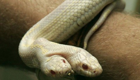 Hồi tháng 7 vừa qua, một con rắn 2 đầu, với khả năng suy nghĩ, săn mồi độc lập và thậm chí tranh giành thức ăn lẫn nhau... đã xuất hiện tại vườn thú ở thành phố Yalta (Ukraine) và nhanh chóng trở thành tâm điểm thu hút sự chú ý tại đây. Con rắn 2 đầu này thuộc giống Kingsnake, có nguồn gốc từ California (Mỹ) và bị bệnh bạch tạng nên có màu da trắng. Con rắn này dài 60cm và đã được 3 tuổi.