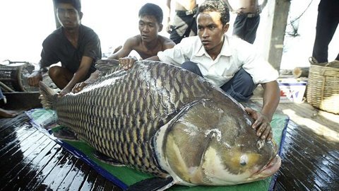 | Một con cá chép sông Mekong nặng hơn 100 kg bị bắt tại Thái Lan năm 2002. Cá chép khổng lồ sông Mekong là một trong những loài cá chép lớn nhất thế giới. Chiều dài thân và khối lượng tối đa của chúng có thể đạt 2,4 m và 250 kg. (Ảnh: hubpages.com) |