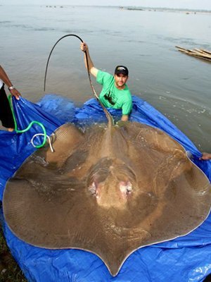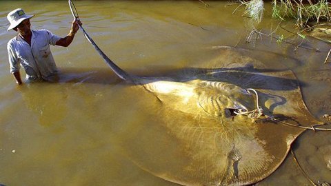 | Cá đuối khổng lồ này được bắt ở sông Mekong chảy qua Campuchia. Hiện nay không ai biết còn bao nhiêu con cá đuối nước ngọt sống trong sông Mekong và liệu chúng có thể sống ở biển như các đuối nước mặn hay không. Tuy nhiên, theo các nhà khoa học do môi trường sống đang dần suy thoái dẫn đến loài cá này cũng vì thế mà dần biến mất (Ảnh: National Geographic) |