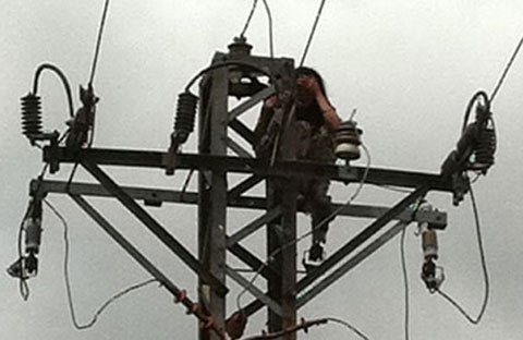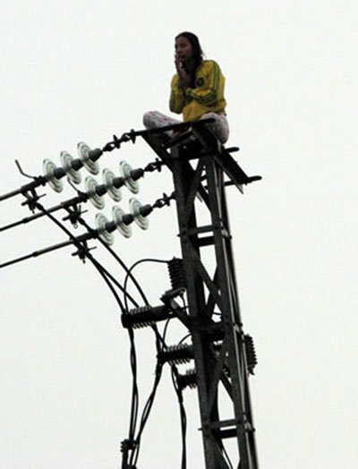 | Nạn nhân ngồi trên trụ điện cao thế. (Ảnh: Lâm Đồng Online) |