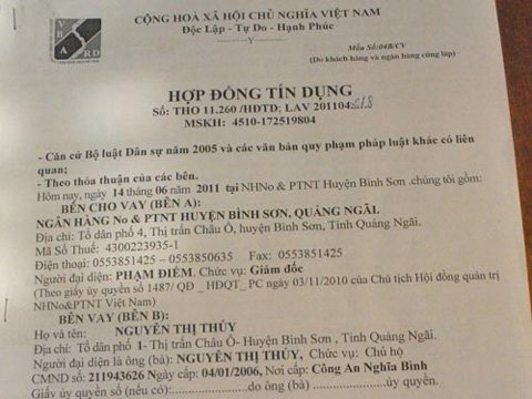| Hợp đồng tín dụng của bà Thúy vay ngân hàng NN&PTNN chi nhánh huyện Bình Sơn số tiền là 1 tỉ đồng |