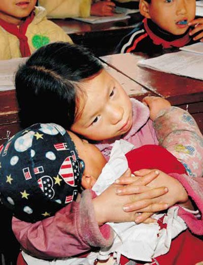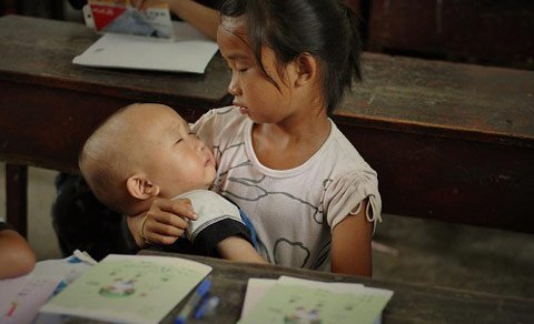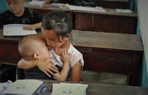 Vào năm 2006, những bức ảnh tương tự về cô bé Ning Yexiang, học sinh lớp 4 của trường tiểu học Đại Đông, tỉnh Quý Châu, Trung Quốc vừa ôm em vừa học cũng từng khiến không ít độc giả rơi lệ.