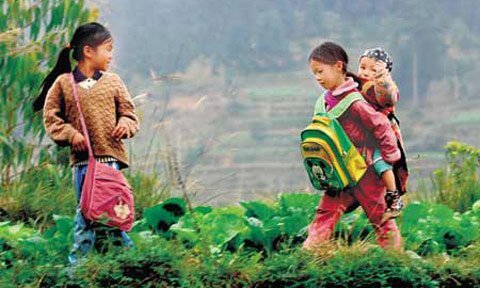 | Bé tranh thủ trông em để ông bà đi làm (Ảnh: Wantchinatimes) |