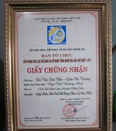 Giấy chứng nhận nghệ nhân nhí nhỏ tuổi sử dụng nhạc cụ hay nhất trong Liên hoan câu lạc bộ dân ca xứ nghệ, tỉnh Nghệ An, lần thứ nhất năm 2011.