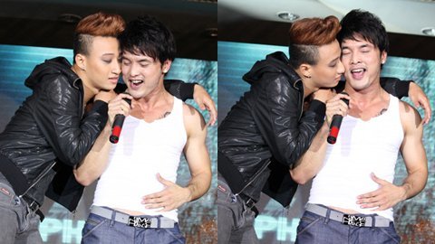 | Sau đó cả hai có những hành động và cử chỉ “âu yếm” khó hiểu đến độ, suýt nữa cả hai hôn nhau trên sân khấu. |