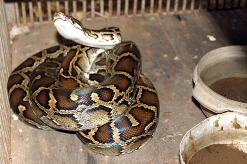 Nói rồi anh Hòa dẫn chúng tôi ra chuồng và lật tấm cửa chắn phía trên cho chúng tôi xem. Theo quan sát, trong chuồng có hai con trăn nằm cuộn tròn, mỗi con có trọng lượng khoảng 4kg, anh Hòa muốn bán từ lâu nhưng không ai mua nên đành để trong chuồng phía ngoài vườn ổi.
