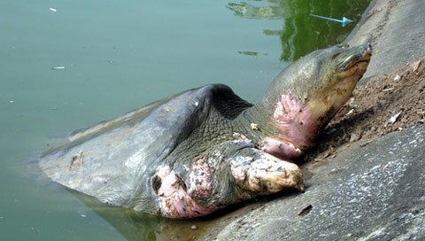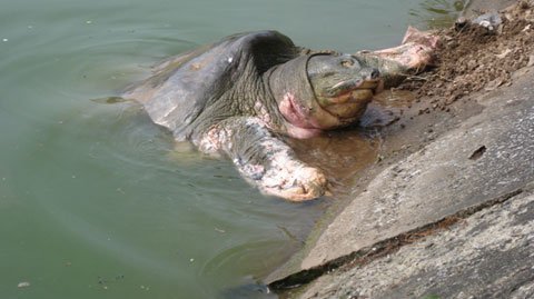 Cụ rướn người khỏi mặt nước, lộ rõ những vết sẹo lồi lõm sau quá trình dưỡng thương (Ảnh: Tuổi trẻ)