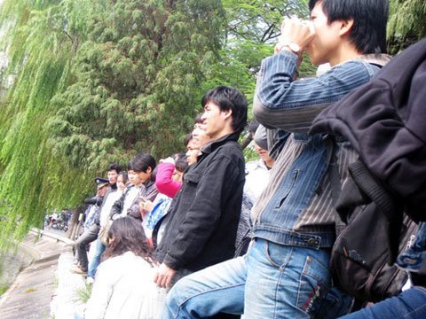 Rất đông người hiếu kỳ đã vây xung quanh để được tận mắt ngắm cụ rùa. (Ảnh: Tuổi trẻ)