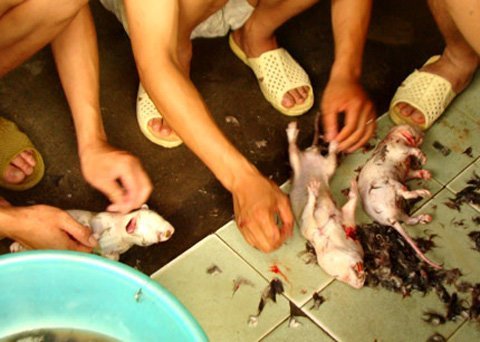 Trông các thực khách nhai con chuột đỏ hỏn, các em phục vụ phải rú lên kinh khiếp. Tất nhiên, các em rú lên không phải vì sợ, bởi các em đã nhìn cảnh đó đến cả ngàn lần rồi. Các em hét càng to, càng tỏ ra sợ hãi, thì thực khách càng khoái trá và bo nhiều hơn…