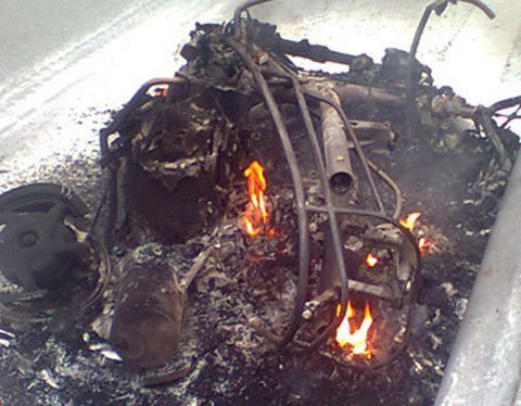 | Chiếc xe Honda Lead bị cháy rụi trong phút chốc và chỉ còn trơ lại khung sắt (Ảnh: Đất Việt) |