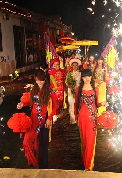 Đám cưới của nữ diễn viên Diệu Hương đã khiến các khách mời ngạc nhiên với tiết mục cô dâu được rước trên thuyền rồng cắm đầy hoa cúc vàng theo nghi thức xưa.