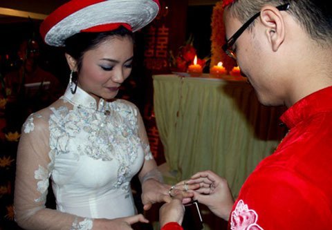 | Giữa không khí trang nghiêm của buổi tiến hành tổ chức lễ cưới theo nghi thức đạo Phật, cô dâu chú rể đã trao nhẫn cho nhau. Cô dâu Diệu Hương đã không kìm được nước mắt xúc động. (Ảnh: Dân trí) |