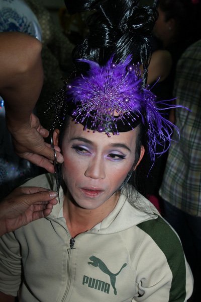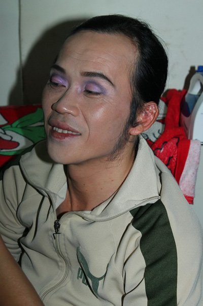 Liveshow Nàng tiên ngổ ngáo bắt đầu lúc 8h10, nhưng từ lúc 6h30 Hoài Linh đã có mặt tại phòng maek-up của hậu trường sân khấu để chuẩn bị biến mình thành... gái
