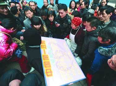Người đàn ông đeo mặt nạ và tấm biển tìm vợ bị vây quanh bởi đám đông (nguồn: