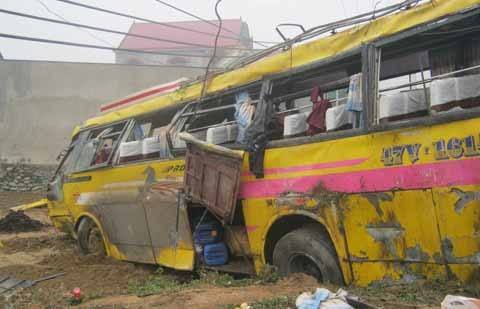 Tại hiện trường chiếc xe khách bị hư hỏng gần như toàn bộ, phần nóc xe bị bẹp