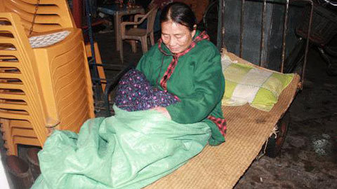 Trong khi người dân khắp nơi nô nức đi sắm sửa để đón một năm mới trang hoàng thì ở một góc chợ Đông Ba, TP.Huế, bà Văn Thị Nở (48 tuổi), trú tại TP Huế và những người bốc vác vẫn phải nằm co ro trên chiếc xe kéo hàng, chờ hàng về để bán sức lao động.