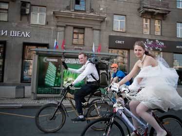 | Cặp vợ chồng vừa cưới vừa đạp xe |