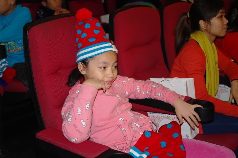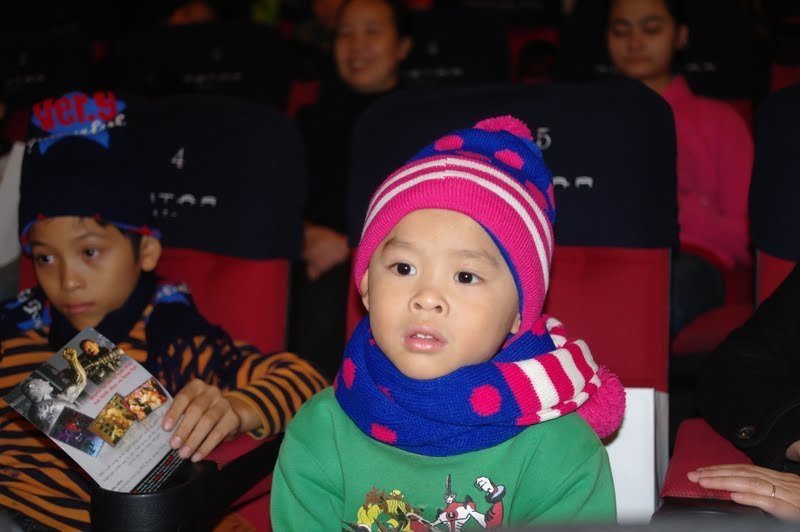 Không khí tại phòng chiếu trước giờ chiếu phim rất sôi động bởi các em rất háo hức đến lúc đèn tắt và những cảnh quay đầu tiên xuất hiện trên màn hình. “Cháu chưa bao giờ được đến rạp xem phim thế này. Cháu rất thích, nhất là lại được các cô chú tặng cho khăn và mũ ấm. Rất đẹp ạ”, bé Giang – 7 tuổi nói.