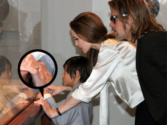 Sự việc Angie để lộ chiếc nhẫn đính hôn khi cùng các con tham dự 1 sự kiện ở Los Angeles County Museum of Art khiến người hâm mộ vô cùng bất ngờ. Đây là chiếc nhẫn do chính Pitt thiết kế và phải mất tới 1 năm để hoàn thành. 2 người sống chung từ năm 2005, đã có 3 con riêng nhưng hoàn toàn kín tiếng về chuyện cưới xin.