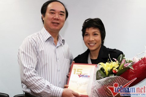 | Tổng biên tập Bùi Sỹ Hoa tặng hoa và kỷ yếu 15 năm VietNamNet cho ca sĩ Mỹ Linh. |