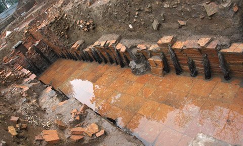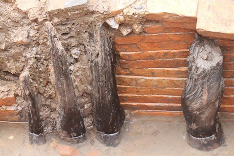 | Các cọc gỗ được đóng ở hai bên thành cống. |