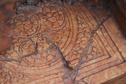 | Miệng cống có một viên gạch hoa lót đáy cống thời Trần với hoa văn đặc trưng hết sức đẹp mắt |
