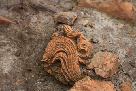 | Một mảnh gốm hoa văn phát lộ trong quá trình khai quật. |
