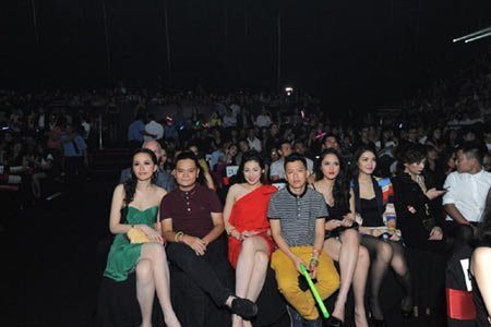Mai Phương Thúy nổi bật không vì vị trí "đắc địa" trong khán phòng Nhà thi đấu Nguyễn Du. Người đẹp hút mọi ánh nhìn bởi bộ đầm lụa duyên dáng khoe tay nuột, chân thon, tóc mềm giản dị buông lơi trên vai ngọc. Sắc xanh ngọc của bộ đầm cùng tông trang điểm hiền hòa tự nhiên của Hoa hậu như một nét chấm phá dịu dàng điểm vào không gian nóng bỏng của đêm nhạc được cho là đáng xem nhất những ngày đầu năm.