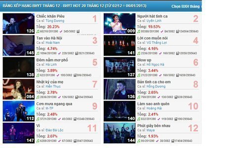 Nói là tạm thời bởi kết quả này đang được BTC chương trình tiếp tục kiểm tra, đặc biệt là các ca khúc đứng đầu. Những tin nhắn, lượt nghe được xác định là vi phạm quy định sẽ bị hủy. Như vậy, với tính chất đặc biệt của liveshow tháng 1/2013, BXH BHYT tháng 12 được đóng bình chọn sớm gần 10 tiếng để BTC kiểm tra bình chọn.