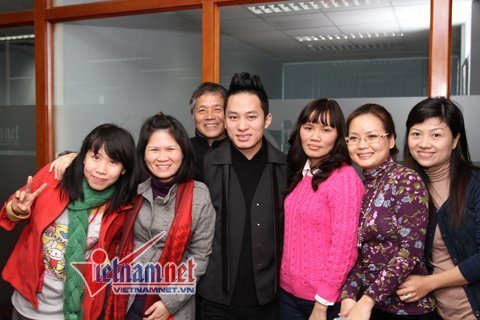 Ca sĩ Tùng Dương chụp ảnh với phóng viên, BTV báo VietNamNet. |
