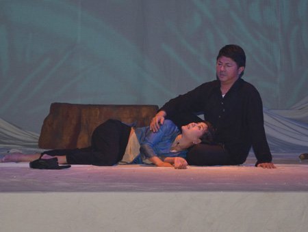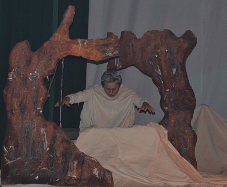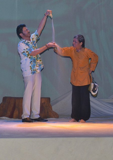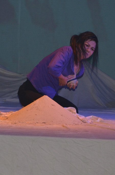 Điểm mới lạ và góp phần không nhỏ vào thành công của vở diễn phải nói tới họa sĩ, diễn viên Đức Trí với vai Gốc phi lao. Gốc phi lao hầu như không có thoại nhưng với việc lặng lẽ ngồi ở góc vườn yên tĩnh, chứng kiến câu chuyện đau thương của cả cuộc đời Nhi. Đức Trí đã khéo léo sử dụng cát để vẽ lên tranh nền với không gian và thời gian cụ thể. Bằng việc chiếu slide, khán giả hoàn toàn bị mê hoặc vào không gian mà Đức Trí tạo ra. Khi thì bờ biển dài cùng hình ảnh mặt trăng, cát, gió, sóng, những bờ lau cỏ dại trong khu vườn cát, gương mặt người con gái trẻ với mái tóc dài gợn xoăn như sóng biển, gương mặt người phụ nữ vấn khăn trên mái tóc khi đã luống tuổi…