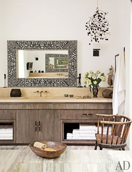 Một góc phòng tắm với chiếc tủ để khăn xinh xắn.
