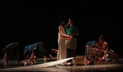 Gần 30 nghệ sĩ đoàn Arabesque đã kể một câu chuyện, ở đó có những người nông dân lưng cong lặng lẽ cần mẫn trên cánh đồng của mình; có những day dứt, vật vã của những người đàn bà vắng chồng, khát yêu thương; có những con người nhỏ bé nghèo khổ vật lộn với thiên tai... thông qua ngôn ngữ cơ thể.