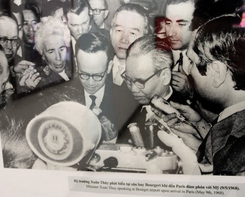 | Bộ trưởng Xuân Thủy phát biểu tại sân bay Bourgert khi đến Paris đàm phán với Mỹ (9/5/1968) |