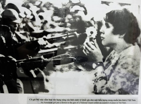 | Bức ảnh được cho là gây ấn tượng nhất tại triển lãm là bức hình cô gái Mỹ cắm hoa vào họng súng của lính cảnh vệ Quốc gia như một biểu tượng mong muốn hòa bình ở Việt Nam. |