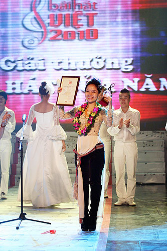 của Bài hát Việt 2010: Giải Bài hát của năm: Việt Nam - Sáng tác & biểu diễn: Mai Khôi Giải Bài hát mang phong cách pop đương đại nổi bật: Hồ Gươm sáng sớm - Sáng tác Lưu Thiên Hương Giải Bài hát mang phong cách rock đương đại nổi bật: Uống trà - Sáng tác & biểu diễn Toàn Thắng Giải Bài hát mang phong cách thính phòng nổi bật: Con ơi hãy ngủ - Sáng tác: An Hiếu – Hoàng Tuấn (Khánh Linh trình bày) Giải Nhạc sĩ tham gia phối khí hiệu quả: Dương Cầm với tác phẩm phối khí Con ơi hãy ngủ. Giải Thể nghiệm sáng tạo: Lá cờ - Sáng tác: Tạ Quang Thắng. Giải Nhạc sỹ ấn tượng: Lưu Thiên Hương (Ca khúc Hồ Gươm sáng sớm) Giải Bài hát được khán giả yêu thích nhất: Uống trà - Sáng tác & biểu diễn: Toàn Thắng Giải Ca sỹ được khán giả yêu thích nhất: Hà Anh Tuấn Giải Ca khúc do Hội nhạc sĩ Việt Nam bầu chọn: Lá cờ - Sáng tác: Tạ Quang Thắng.