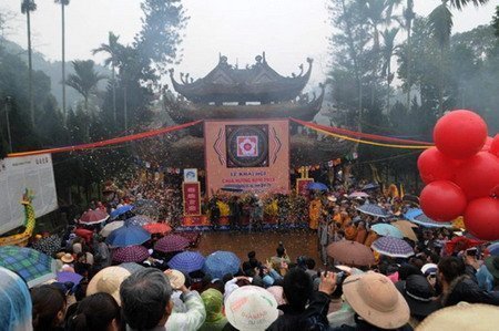 Đúng 9h, lễ khai hội chùa Hương năm 2013 với chủ đề “Nét đẹp truyền thống văn hóa Việt” chính thức bắt đầu.