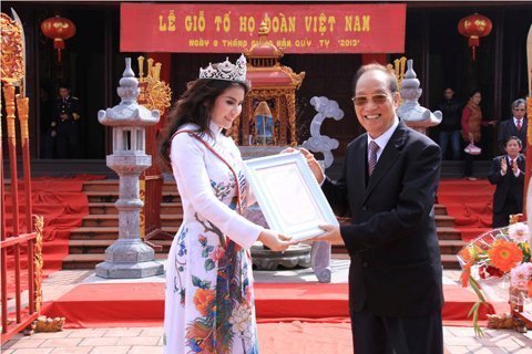 | Ông Đoàn Duy Thành trao thư khen của dòng họ Đoàn cho Kim Hồng. |