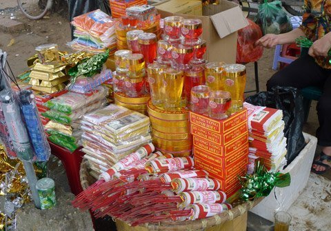 Khắp các chùa, tình trạng bày bán hương, hoa, vàng mã nên nhiều người đã mua và mang cả vào chùa.