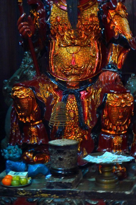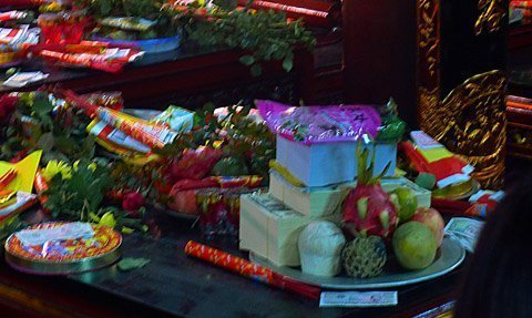 | Mâm lễ tại chùa Hà với một chồng tiền đô la giấy |